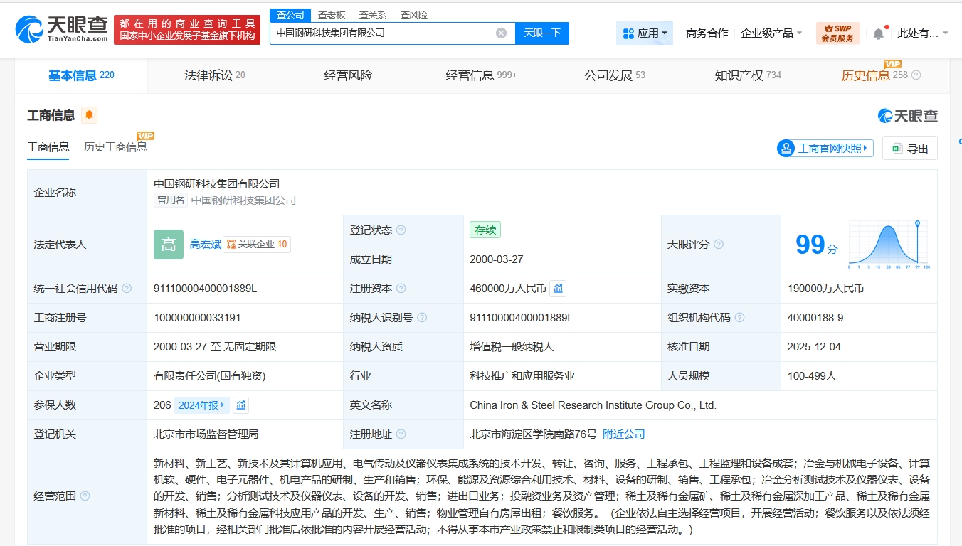 天眼查工商信息显示,近日,中国钢研科技集团有限公司发生工商变更,张少明卸任法定代表人、董事长,由高宏斌接任,注册资本由19亿人民币增至46亿人民币,同时,多位高管均发生变更。