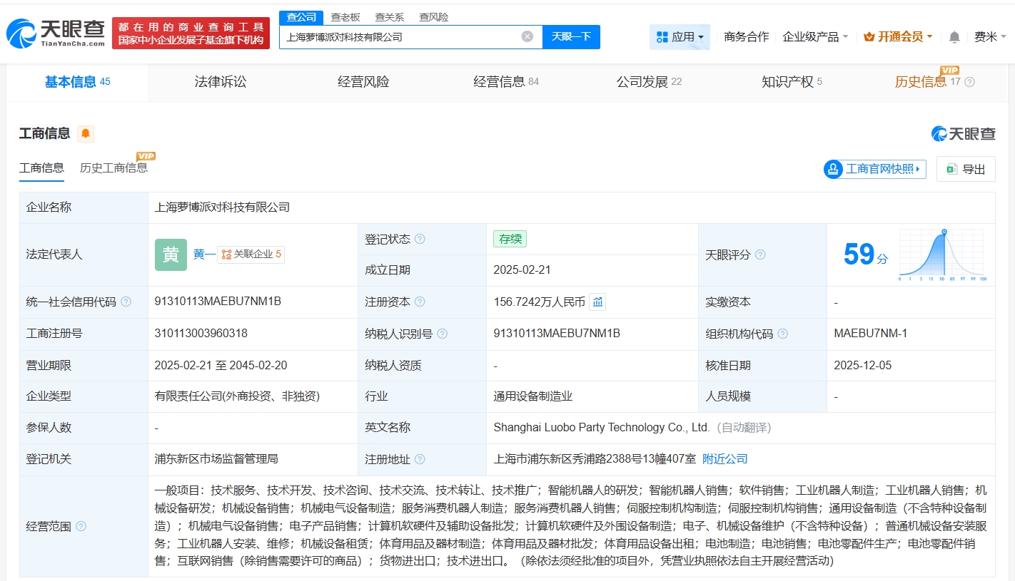 该公司成立于今年2月,法定代表人为黄一,经营范围包括智能机器人的研发、智能机器人销售、工业机器人制造等,现由上海萝博特企业管理咨询合伙企业(有限合伙)、MPC VII PTE. LTD.及上述新增股东等共同持股。官网显示,萝博派对是一家专注于人形机器人的前沿科技公司。