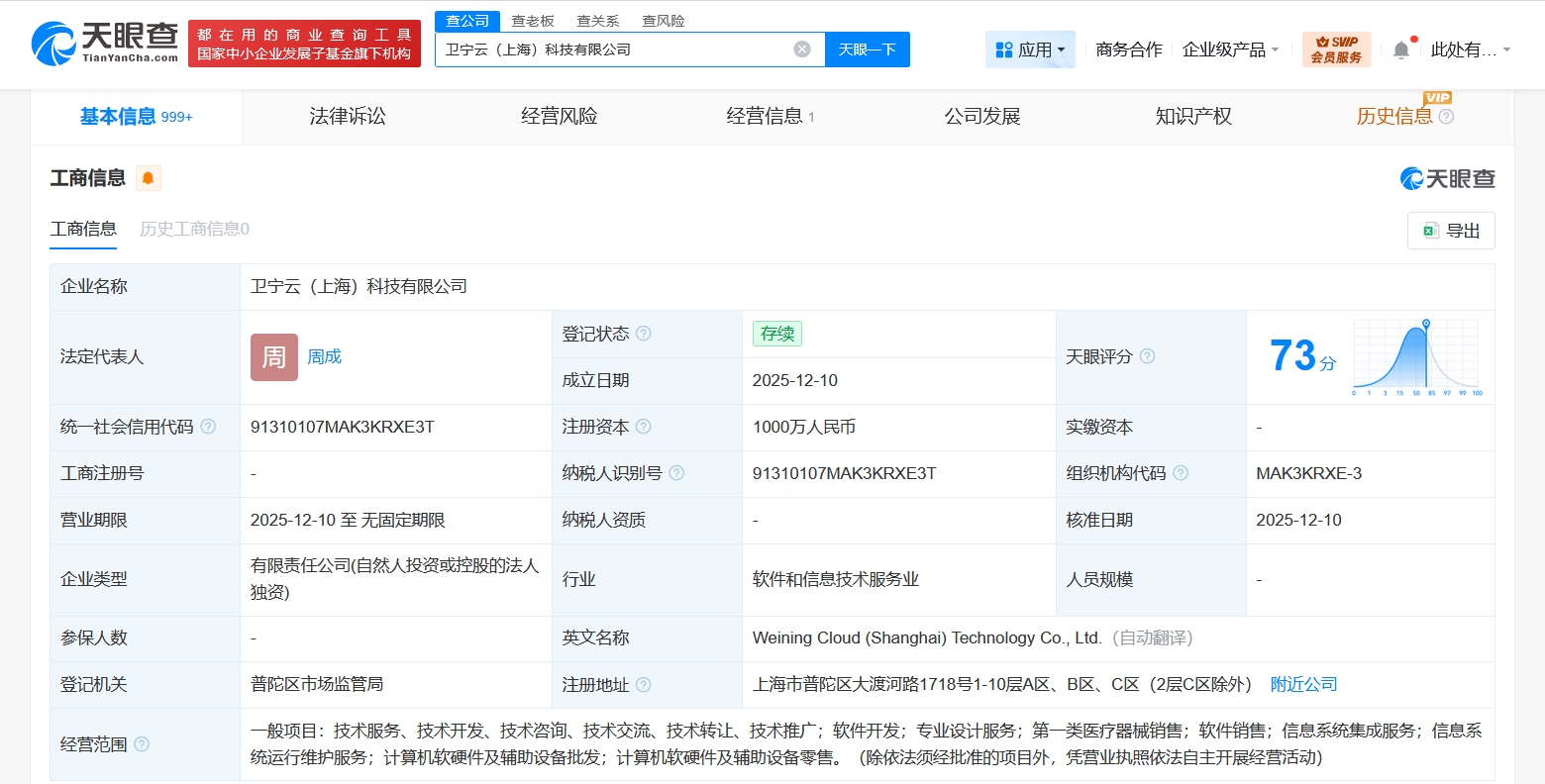 天眼查App显示,近日,卫宁云(上海)科技有限公司成立,法定代表人为周成,注册资本1000万人民币,经营范围含软件开发、专业设计服务、第一类医疗器械销售、软件销售、信息系统集成服务、信息系统运行维护服务、计算机软硬件及辅助设备批发、计算机软硬件及辅助设备零售等。股东信息显示,该公司由卫宁健康(300253)全资持股。