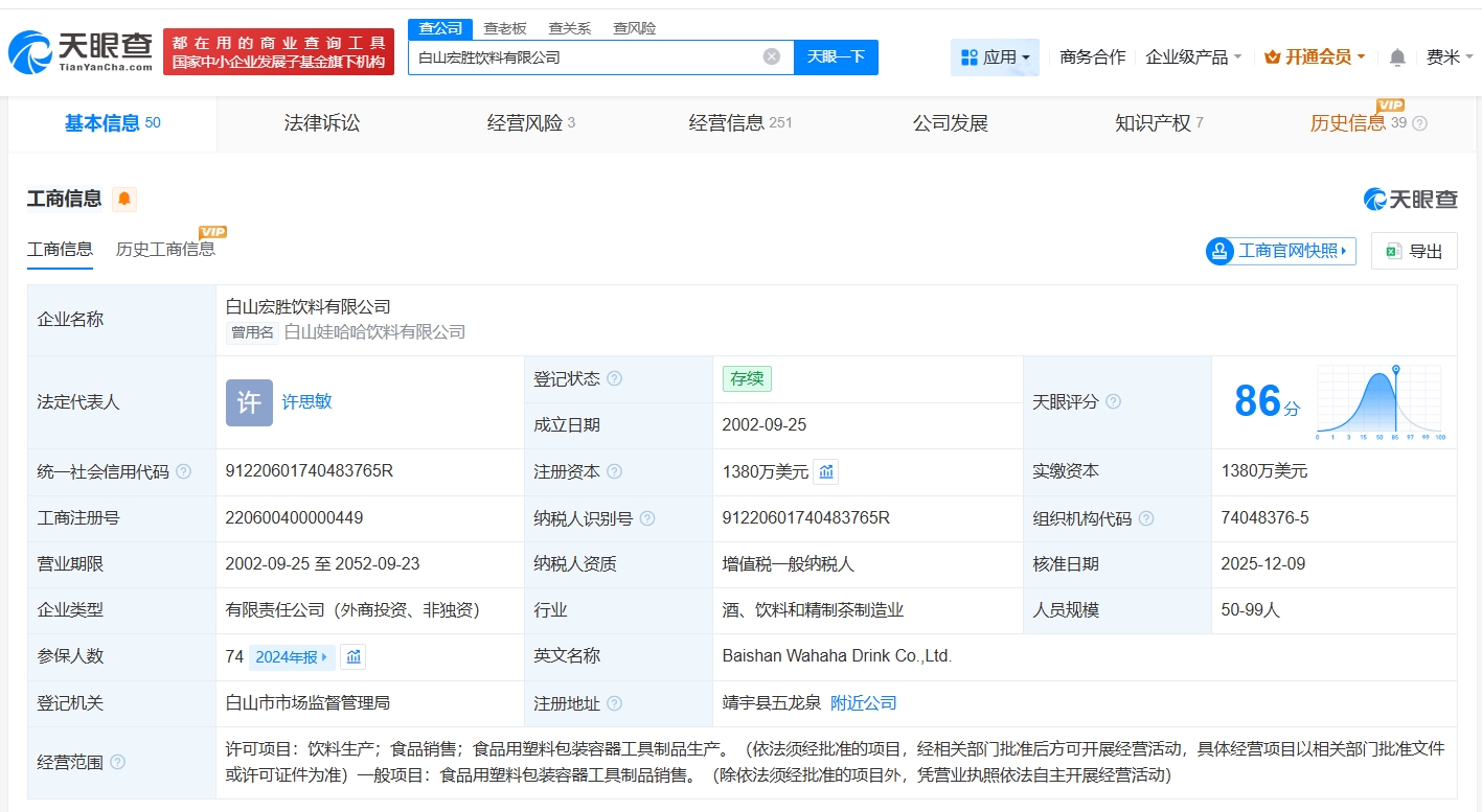 天眼查App显示,近日,白山宏胜饮料有限公司发生工商变更,祝丽丹卸任法定代表人、总经理,由许思敏接任。